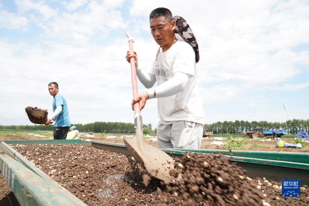 在鐵力市工農鄉五一村的平貝采收現場(chǎng),農業(yè)務(wù)工人員進(jìn)行篩土作業(yè)(7月1日攝)。