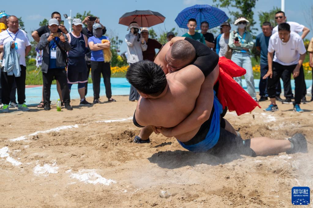 7月2日,在第十一屆赫哲族烏日貢大會(huì )現場(chǎng),赫哲族選手參加摔跤比賽。