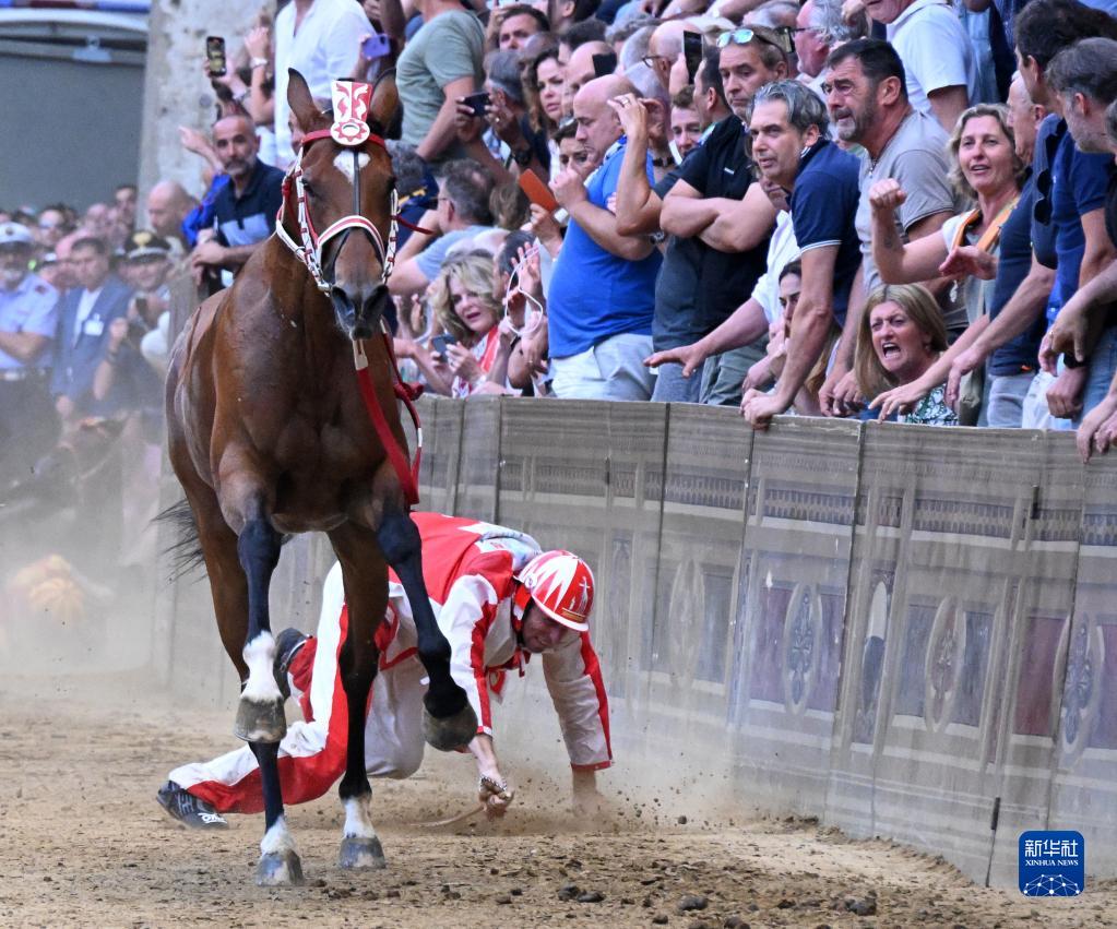 7月2日,在意大利錫耶納傳統賽馬節上,一名騎手摔下馬。