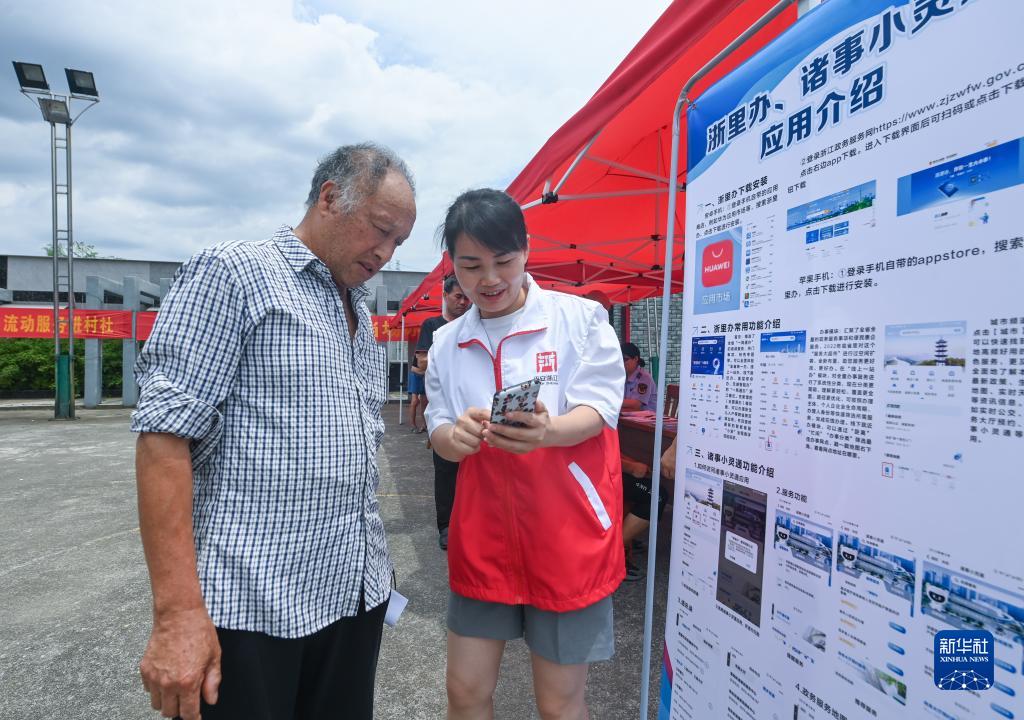 7月3日,諸暨市店口鎮便民服務(wù)中心在上畈村開(kāi)展政務(wù)服務(wù)進(jìn)村入社“流動(dòng)服務(wù)”活動(dòng),村級代辦員在給村民講解“諸事小靈通”APP的使用方法。