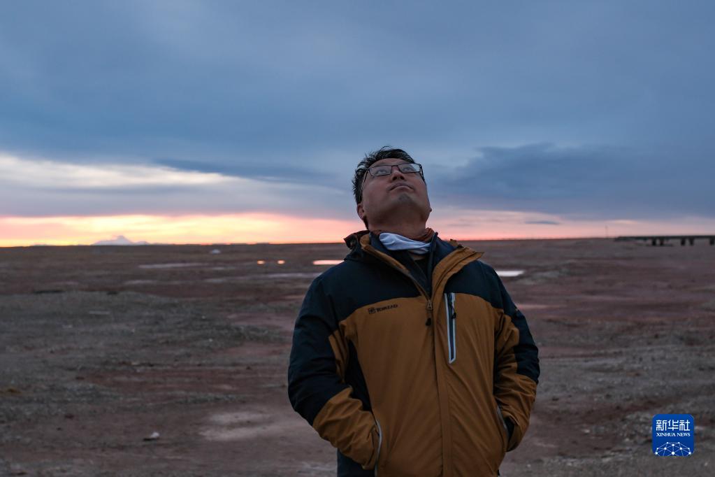 6月16日凌晨,連新明團隊在青藏公路楚瑪爾河大橋附近監測藏羚羊遷徙途中的夜宿地,連新明抬頭觀(guān)察無(wú)人機飛行情況。