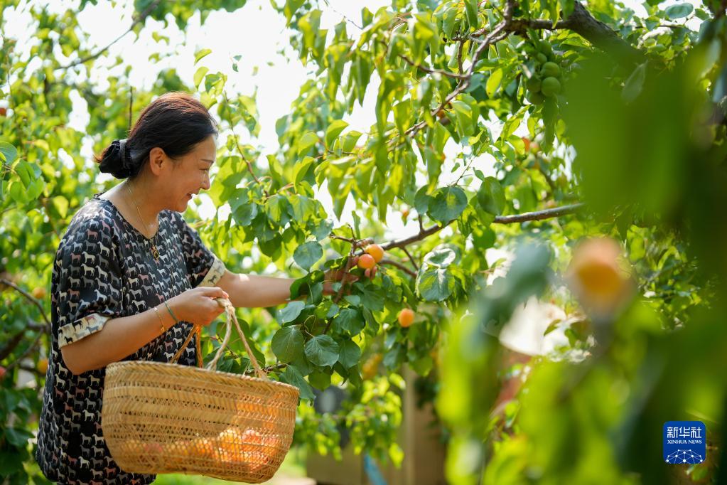 7月3日,市民在河北省唐山市路北區一處家庭農場(chǎng)內采摘鮮杏。