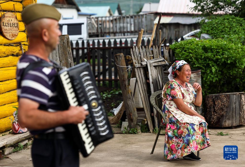 6月28日,考占花(右)坐在院子里唱起俄羅斯族歌曲。