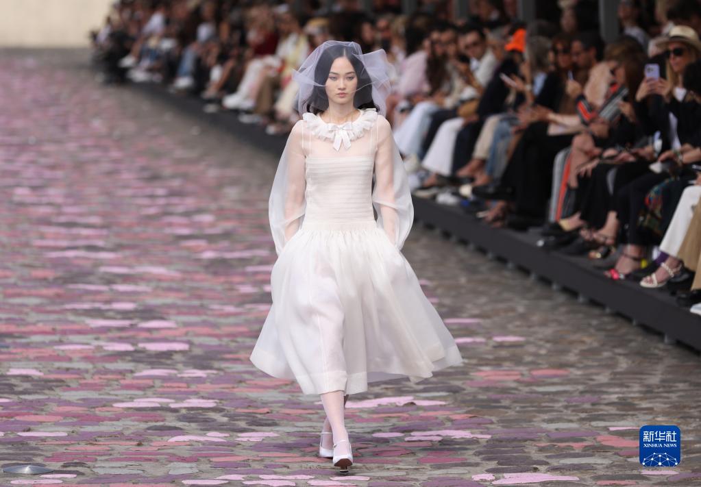 7月4日,在法國巴黎塞納河邊,模特展示法國品牌香奈兒2023/2024秋冬高級定制新品。