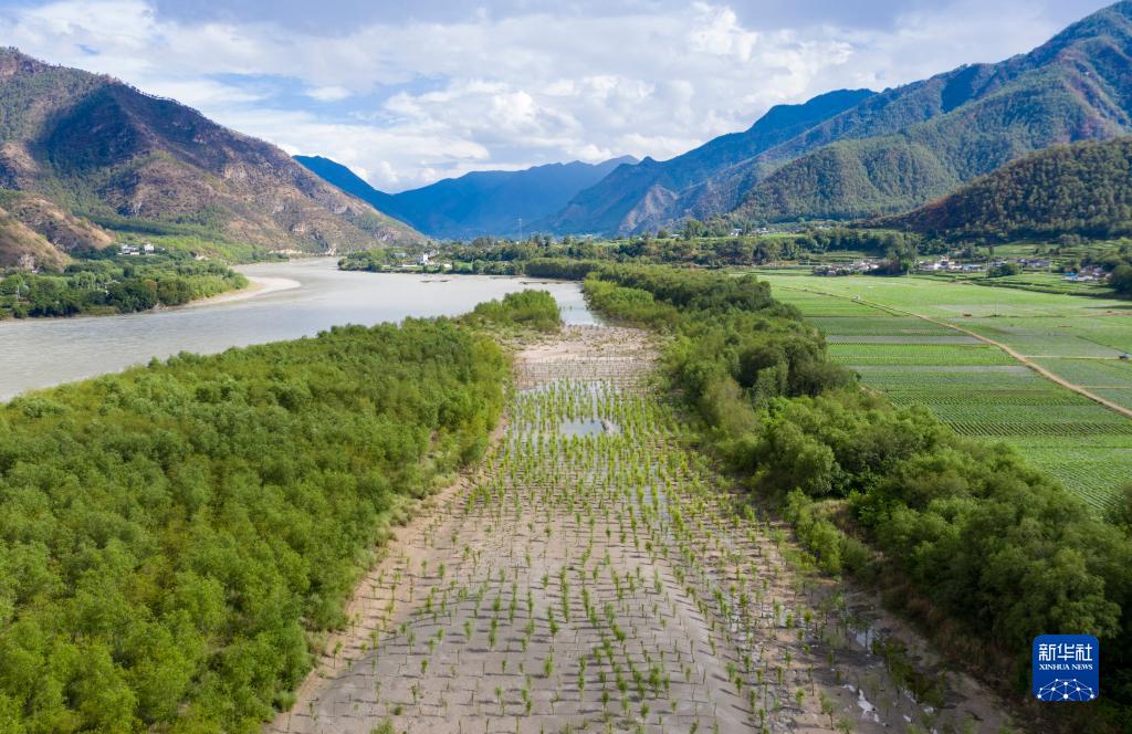 這是6月20日在麗江市石鼓鎮拍攝的金沙江邊的柳林,中間部分為新栽種柳樹(shù)(無(wú)人機照片)。多年來(lái),云南省麗江市石鼓鎮林業(yè)工作者帶領(lǐng)群眾在江邊種下10萬(wàn)余株柳苗。如今江畔柳林郁郁蔥蔥,成為一道防風(fēng)固沙的天然屏障,有效減少了汛期江水對農田的侵蝕。