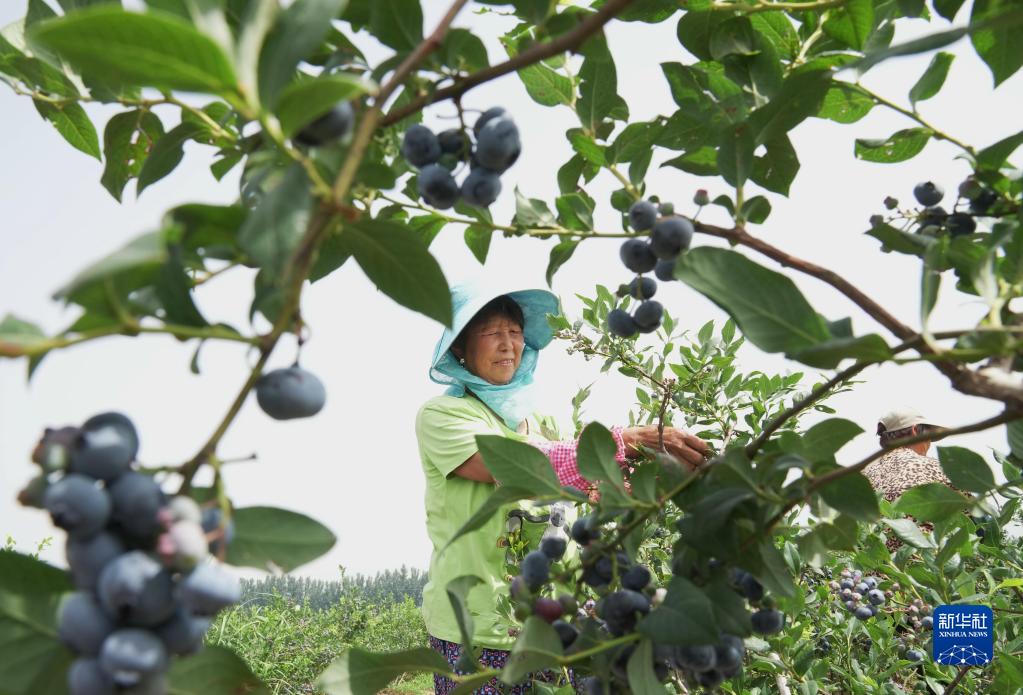 7月5日,河北省灤州市東安各莊鎮三山院村的農民在田間采摘藍莓。