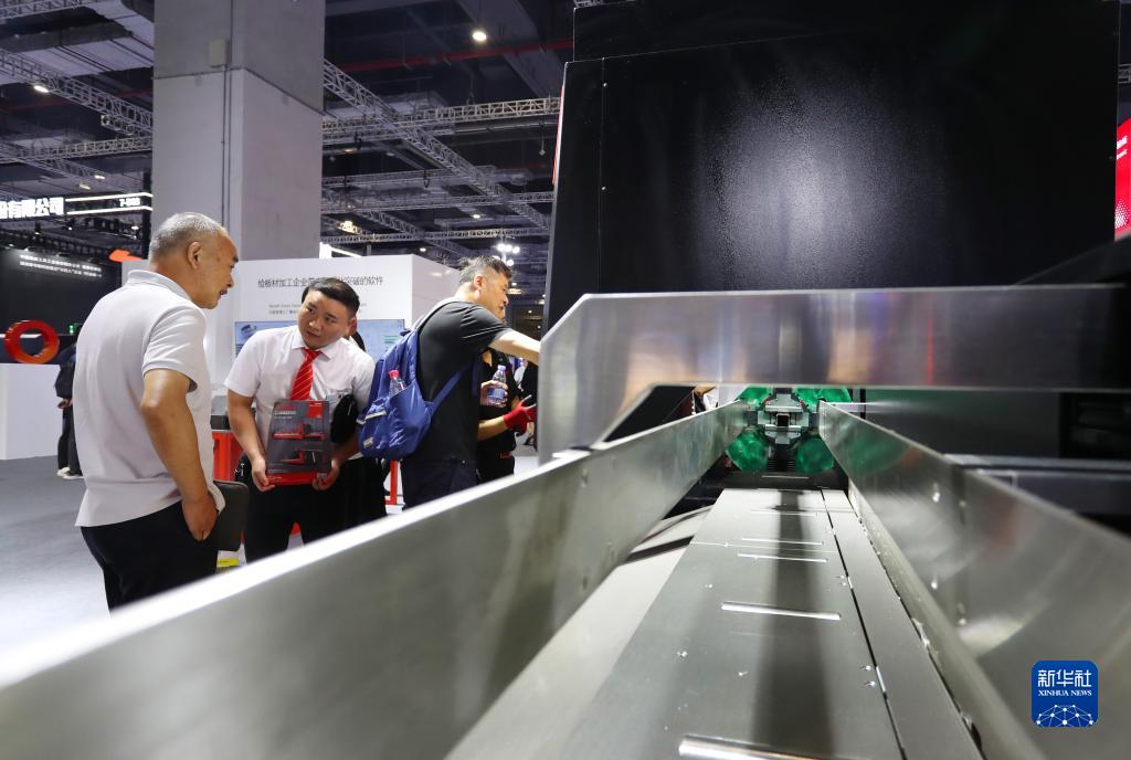 7月5日,參觀(guān)者在一臺光纖激光切管機旁與工作人員交流討論。