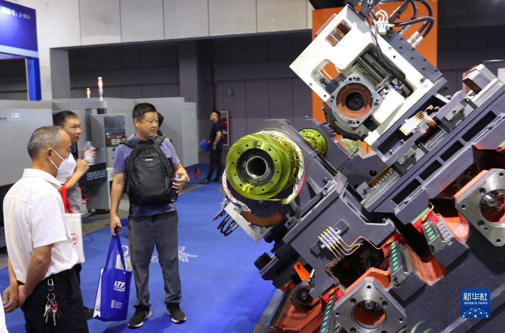7月5日,參觀(guān)者在一臺進(jìn)行模擬作業(yè)演示的機床前駐足觀(guān)看。