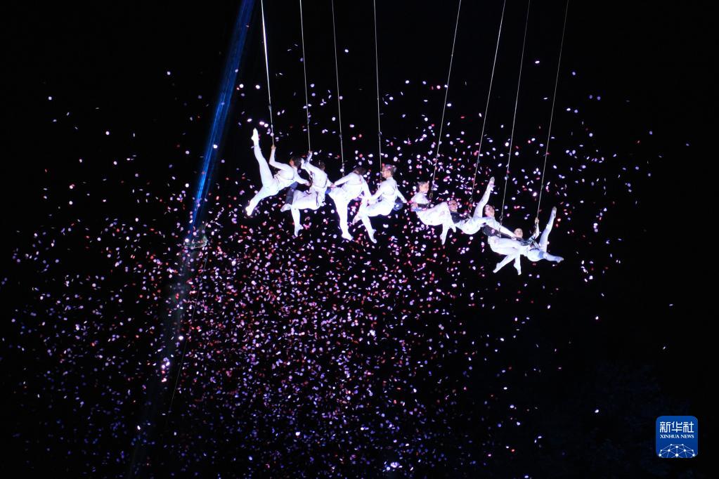 7月5日,舞蹈演員在西班牙馬德里“城市之夏”藝術(shù)節上表演“空中芭蕾”。