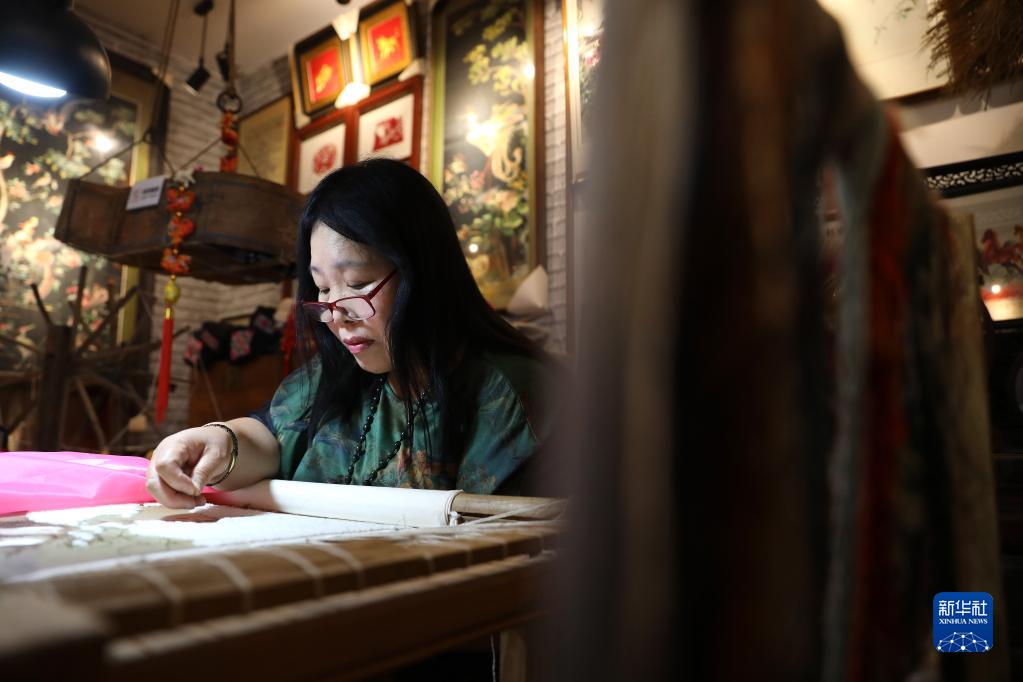 7月5日,王立君在位于遼寧省營(yíng)口市遼河老街上的工作室里進(jìn)行滿(mǎn)繡創(chuàng )作。
