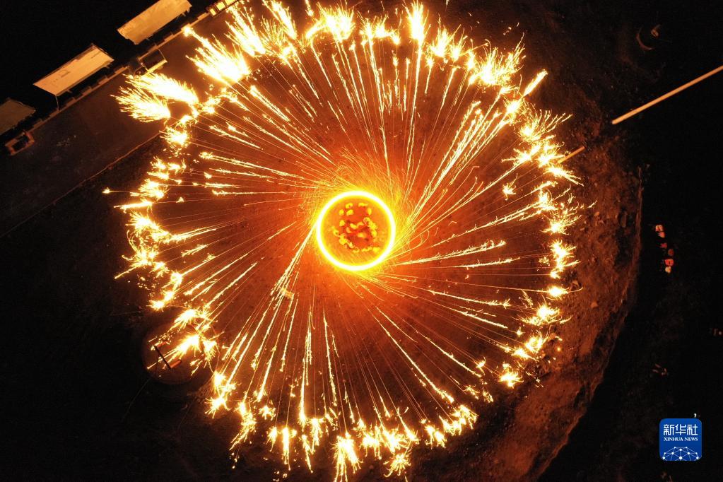 “掄花”是河北省灤平縣一項傳統民俗,已被列入國家級非物質(zhì)文化遺產(chǎn)名錄。表演時(shí),幾名民間藝人將木炭和碎鐵片一起放到掛在花架上的花筒中燃燒,再合力掄起花架,使花筒內升溫并向四周甩濺鐵花,形成一圈圈光線(xiàn)交織的光環(huán),景象壯觀(guān)。