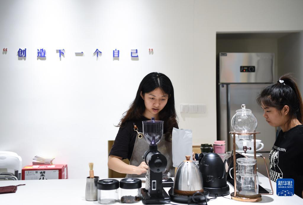7月5日,在廣州市白云區的手心咖啡店,視障咖啡師陳柳曉(左)在制作咖啡。