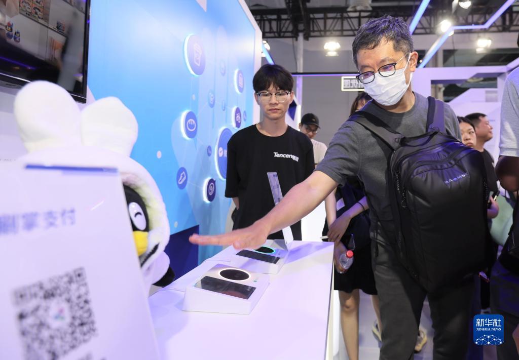 7月6日,參觀(guān)者在騰訊展位體驗刷掌支付。