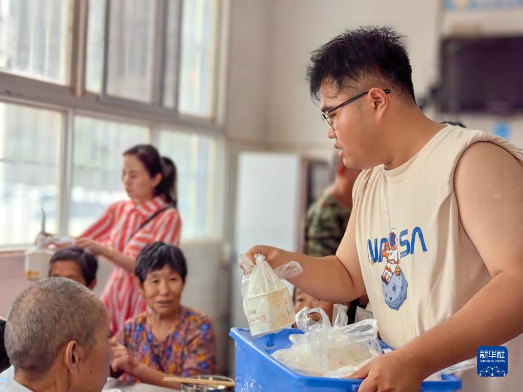 7月6日,志愿者在位于重慶市萬(wàn)州區長(cháng)灘初級中學(xué)的臨時(shí)安置點(diǎn)發(fā)放餐食。