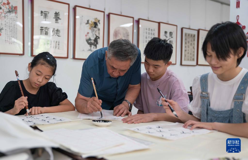 7月6日,在黃驊市海濱學(xué)院社區“多彩暑期·向陽(yáng)花開(kāi)”公益課堂,志愿者教孩子們書(shū)法。