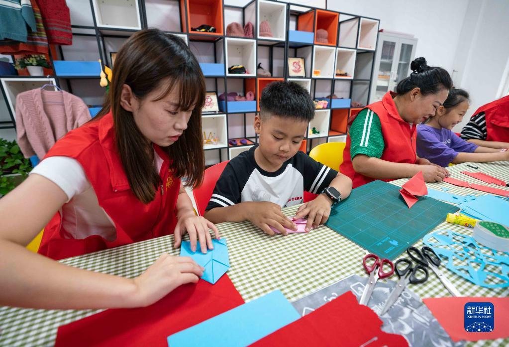 7月6日,在黃驊市海濱學(xué)院社區“多彩暑期·向陽(yáng)花開(kāi)”公益課堂,志愿者教孩子們折紙。