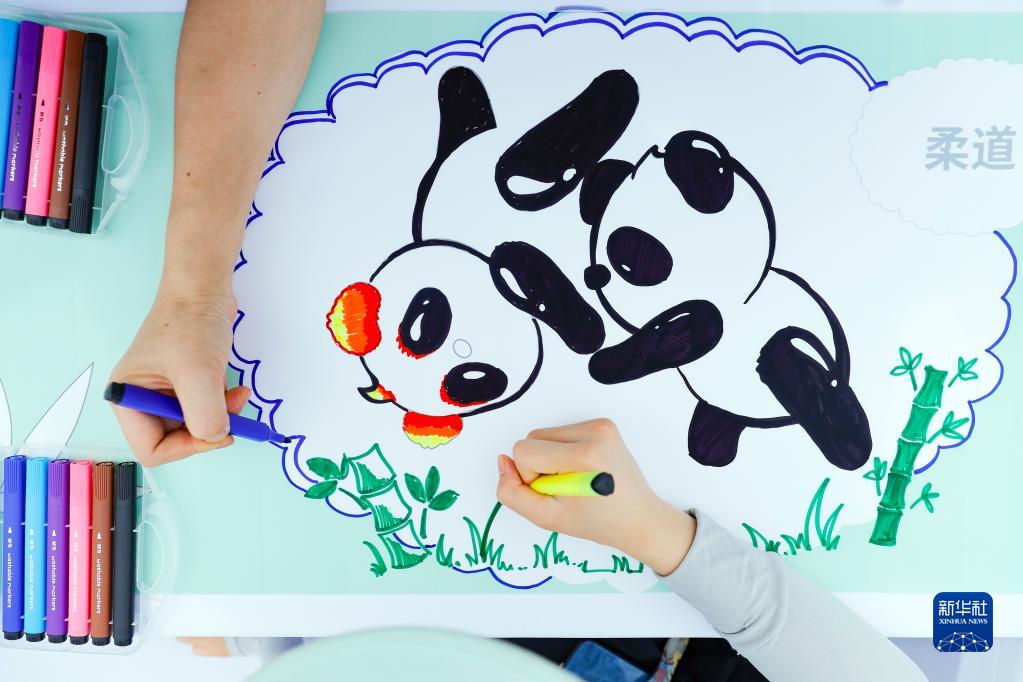 7月6日,一名孩子與家長(cháng)一起在大運會(huì )主題長(cháng)卷上繪制展現柔道比賽內容的熊貓造型圖案。