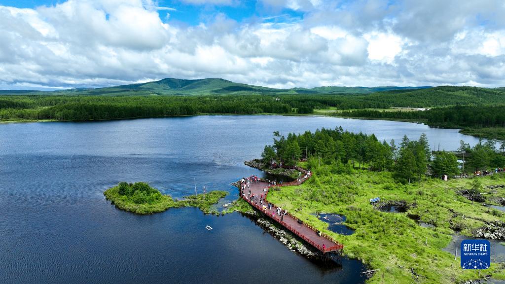 7月6日,游客在阿爾山國家森林公園杜鵑湖游玩(無(wú)人機照片)。