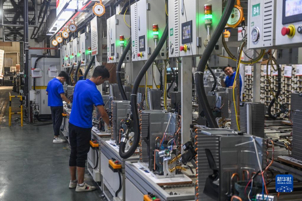 7月6日,工人在位于慈溪市的浙江夏寶電器有限公司裝配空調外機。