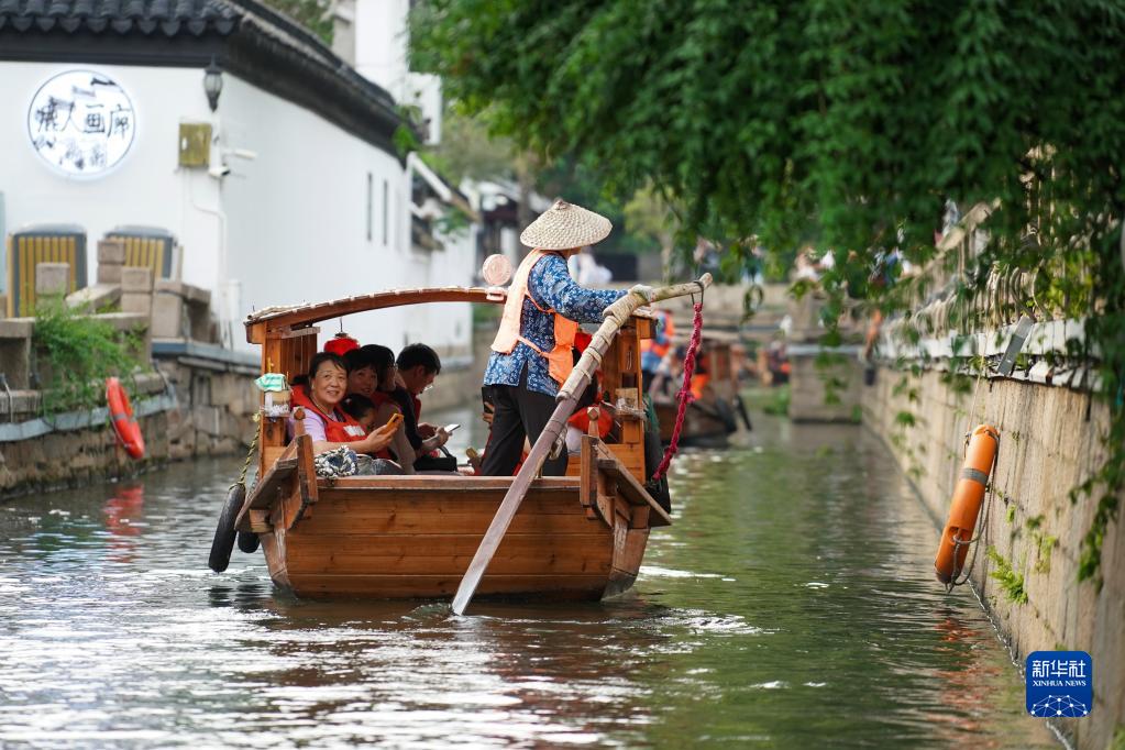 游客乘船在蘇州平江歷史街區休閑游玩(7月3日攝)。