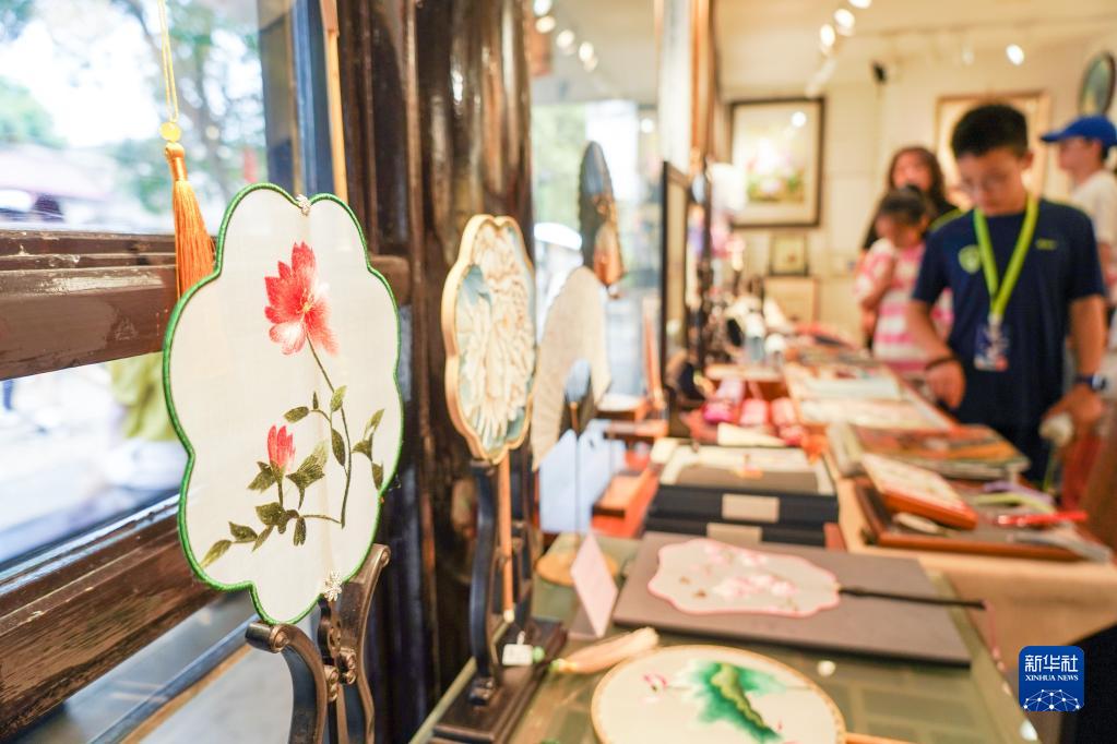 7月6日,游客在蘇州平江路一家蘇繡店內選購紀念品。