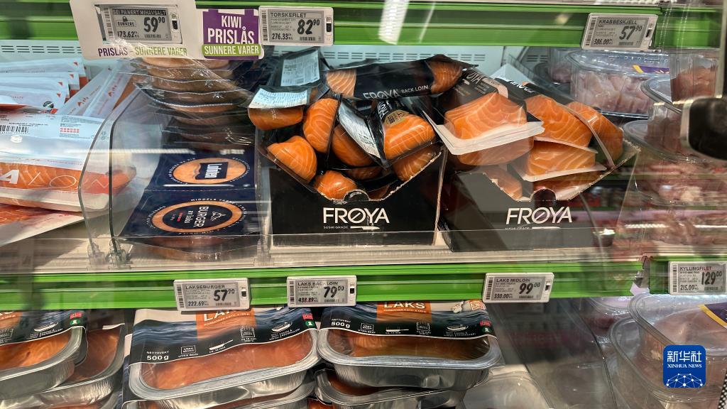 這是7月5日在挪威首都奧斯陸一家超市拍攝的三文魚(yú)等海產(chǎn)品。