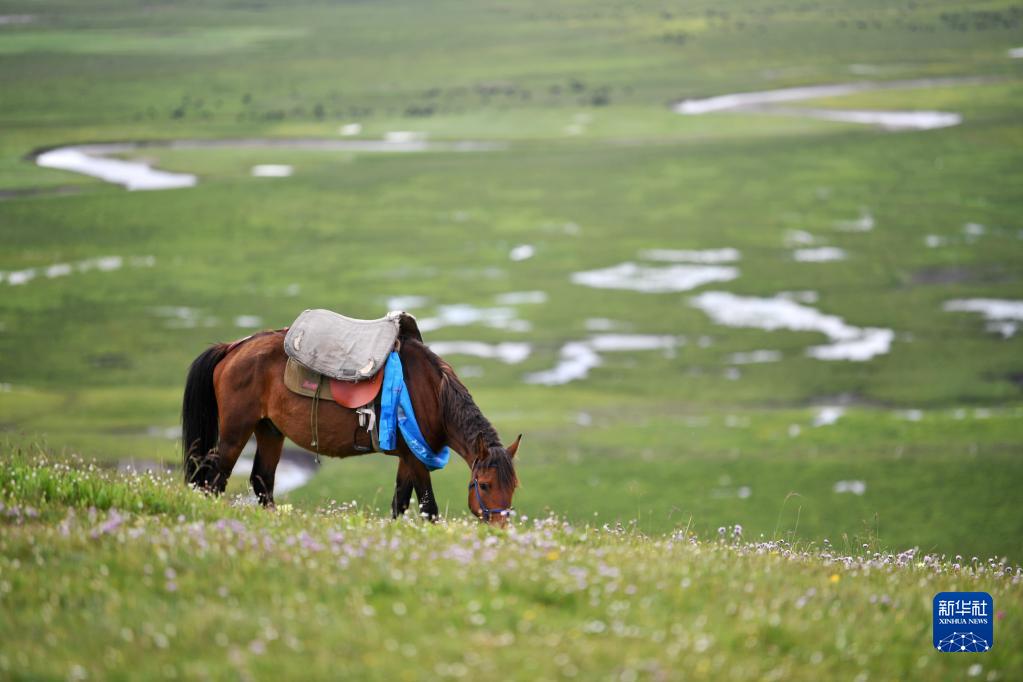 一匹馬在瑪曲縣阿萬(wàn)倉濕地上吃草(7月6日攝)。