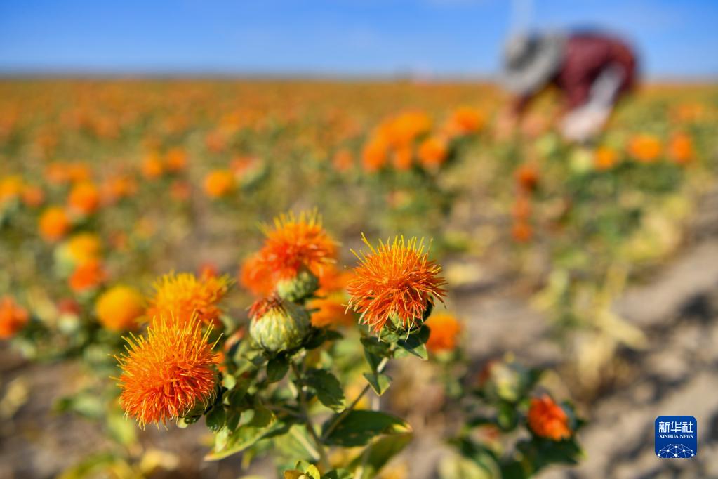 新疆裕民15萬(wàn)多畝紅花迎來(lái)收獲季
