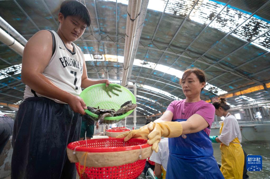 7月7日,在滄州渤海新區黃驊市一家水產(chǎn)養殖開(kāi)發(fā)股份有限公司養殖車(chē)間,工人在分揀石斑魚(yú)。