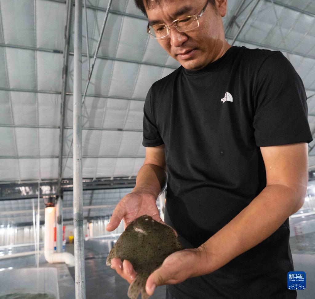 7月7日,在滄州渤海新區黃驊市一家水產(chǎn)養殖有限公司養殖車(chē)間,工人在查看多寶魚(yú)生長(cháng)情況。