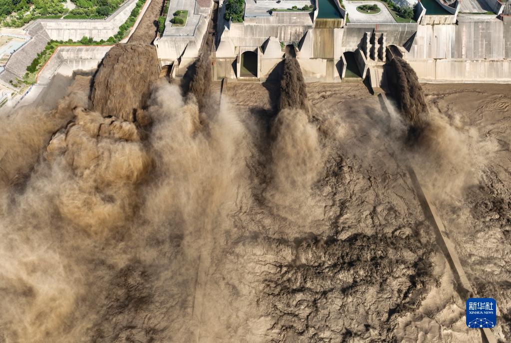 這是7月7日拍攝的黃河小浪底水庫排沙出庫場(chǎng)景(無(wú)人機照片)。
