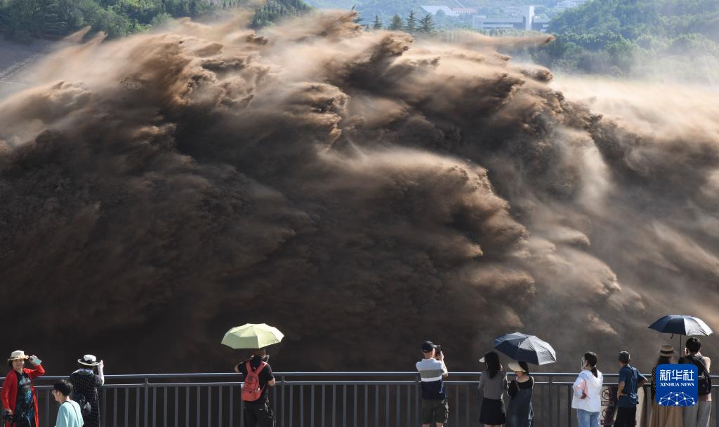 7月7日,游客觀(guān)看黃河小浪底水庫排沙出庫。