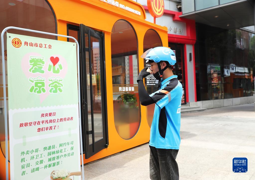 7月7日,外賣(mài)配送員在浙江舟山市一處“勞動(dòng)者驛站”飲用“愛(ài)心涼茶”。