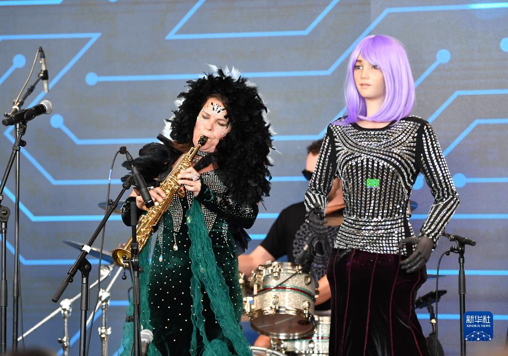 7月7日,在瑞士日內瓦“人工智能造福人類(lèi)全球峰會(huì )”上,仿真機器人德斯迪莫納與樂(lè )隊一起在舞臺上演出。