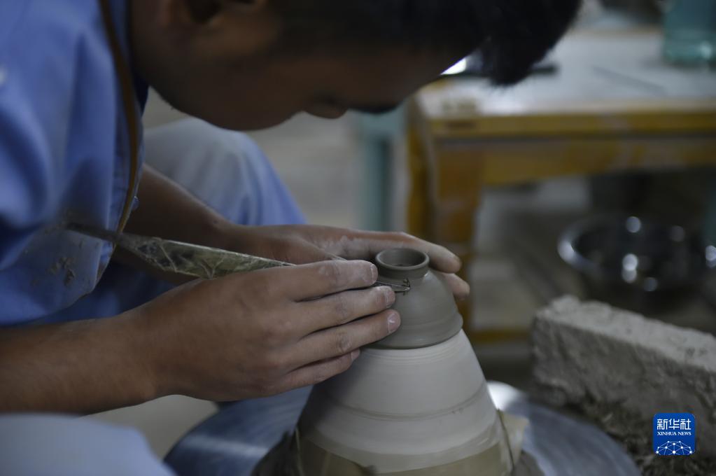 7月6日,工作人員在河南省汝州市玉松汝瓷有限公司的車(chē)間里制作汝瓷產(chǎn)品。