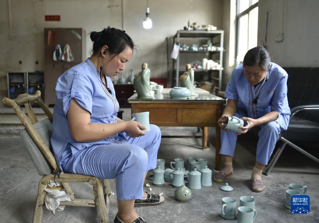 7月7日,工作人員在河南省汝州市玉松汝瓷有限公司的車(chē)間里檢測汝瓷產(chǎn)品質(zhì)量。