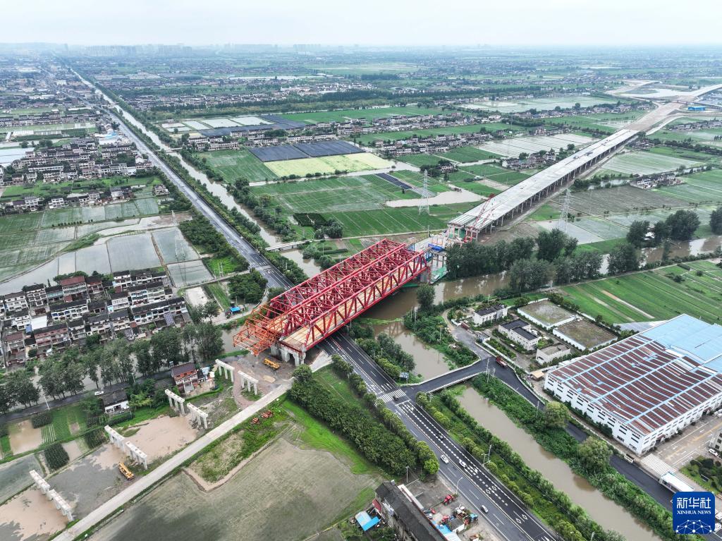 7月8日拍攝的常泰長(cháng)江大橋南北公路接線(xiàn)工程跨G345特大橋鋼桁梁頂推作業(yè)現場(chǎng)(無(wú)人機照片)。