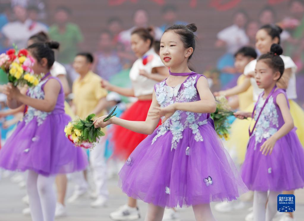 7月8日,在哈爾濱市太陽(yáng)島景區太陽(yáng)石廣場(chǎng),演職人員在慶祝儀式上表演。