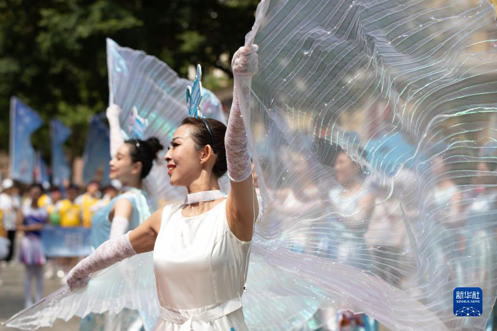 7月8日,在哈爾濱市中央大街上,人們參加巡游慶祝。