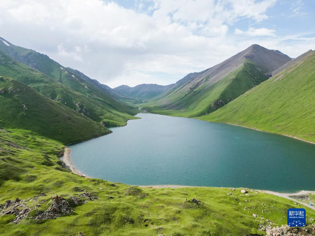 這是和靜縣一處高山湖泊景觀(guān)(7月5日攝,無(wú)人機照片)。