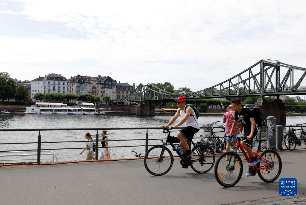 7月8日,人們騎車(chē)經(jīng)過(guò)德國法蘭克福美因河畔。