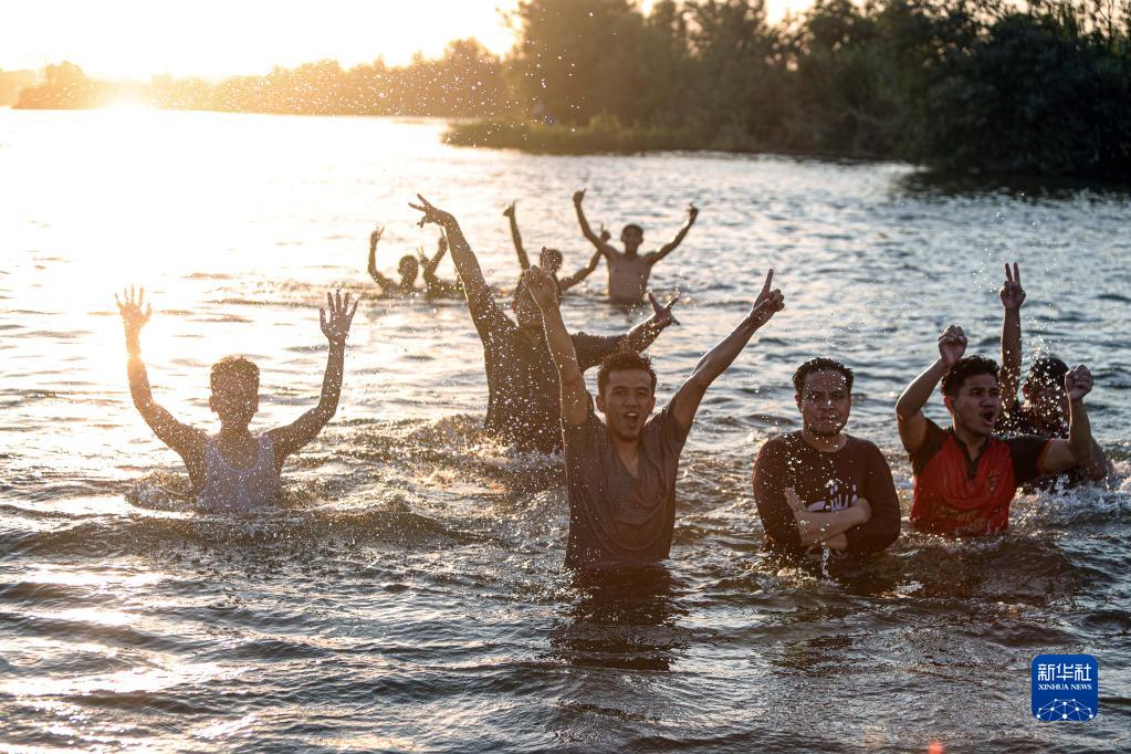 7月8日,在埃及蓋盧比尤省,人們在尼羅河里戲水避暑。