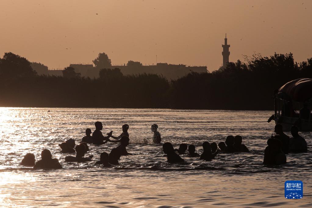 7月8日,在埃及蓋盧比尤省,人們在尼羅河里戲水避暑。