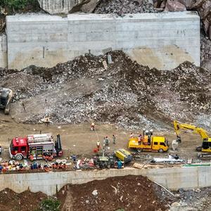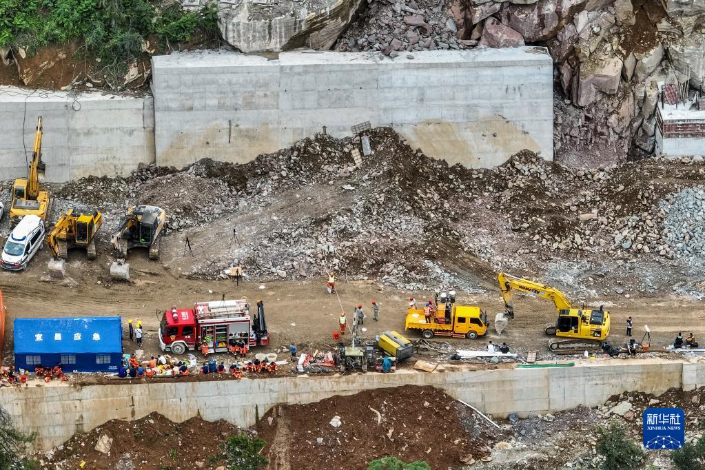 7月9日,救援人員在滑坡現場(chǎng)勘察(無(wú)人機照片)。