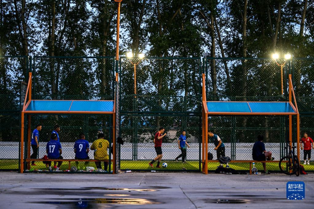 6月26日,巴達瑪斯仁(右五)修完圍欄后,在五人制球場(chǎng)內踢球。