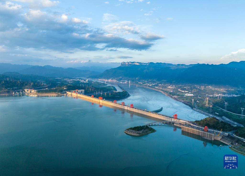 這是7月9日在湖北省宜昌市拍攝的夕陽(yáng)映照下的三峽水利樞紐工程(無(wú)人機照片)。