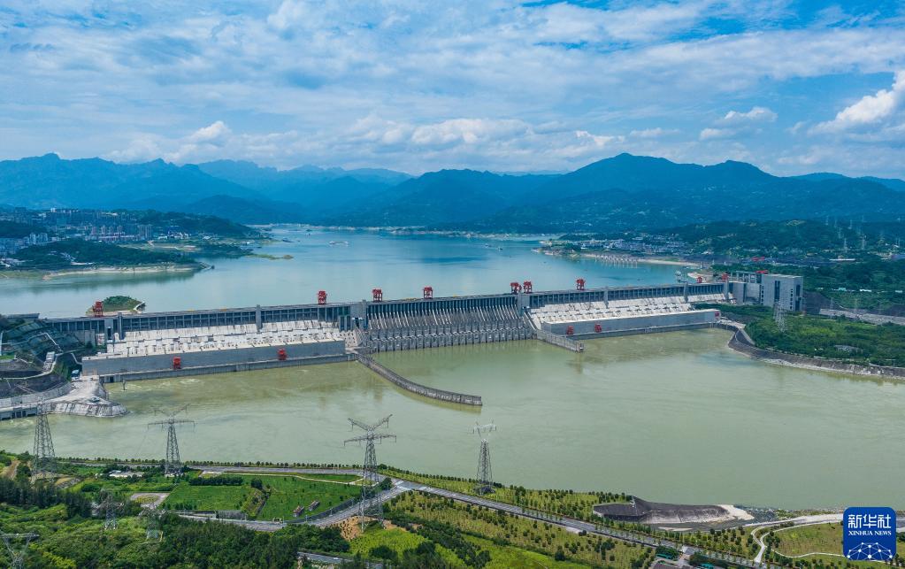 7月10日在湖北省宜昌市拍攝的長(cháng)江三峽水利樞紐工程和右岸外送輸電線(xiàn)路(無(wú)人機照片)。