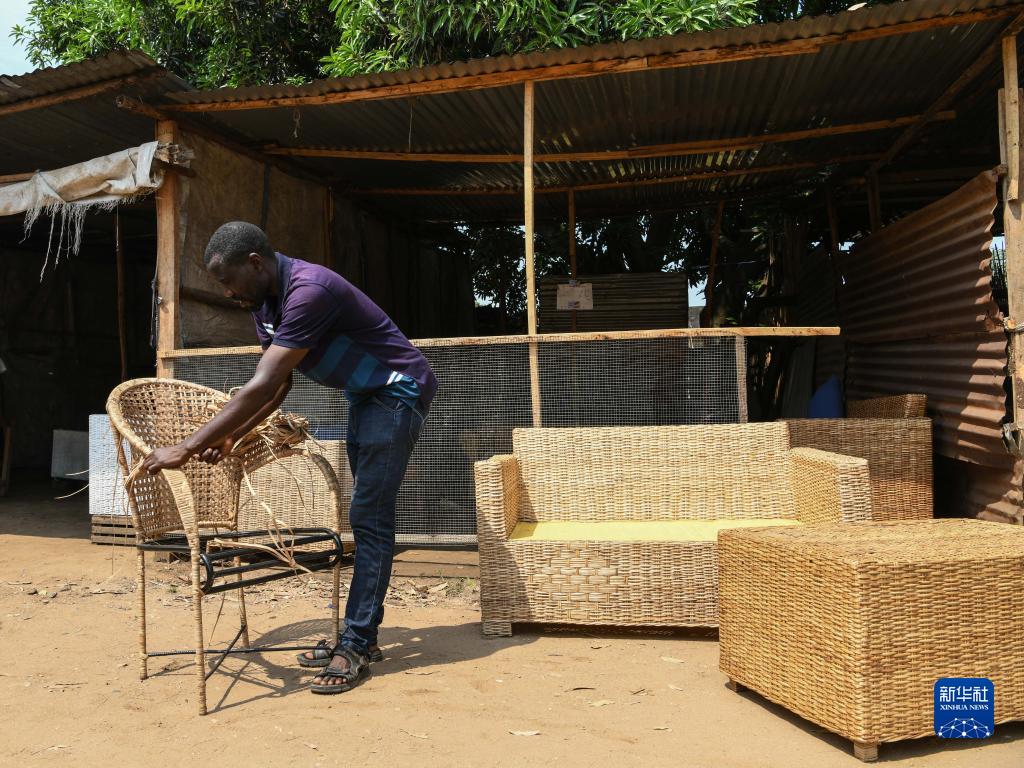6月21日,在布隆迪經(jīng)濟首都布瓊布拉,卡蒙蓋手工業(yè)培訓中心青年培訓項目結業(yè)學(xué)員恩達伊施米耶·塞萊馬尼在自己開(kāi)設的竹藤產(chǎn)品商鋪忙碌。