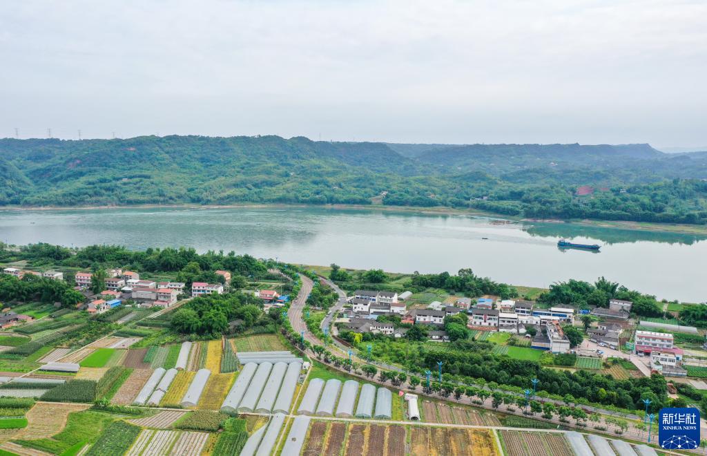 這是6月29日在四川省宜賓市南溪區長(cháng)江邊拍攝的長(cháng)江村和“菜稻菜”蔬菜示范基地(無(wú)人機照片)。