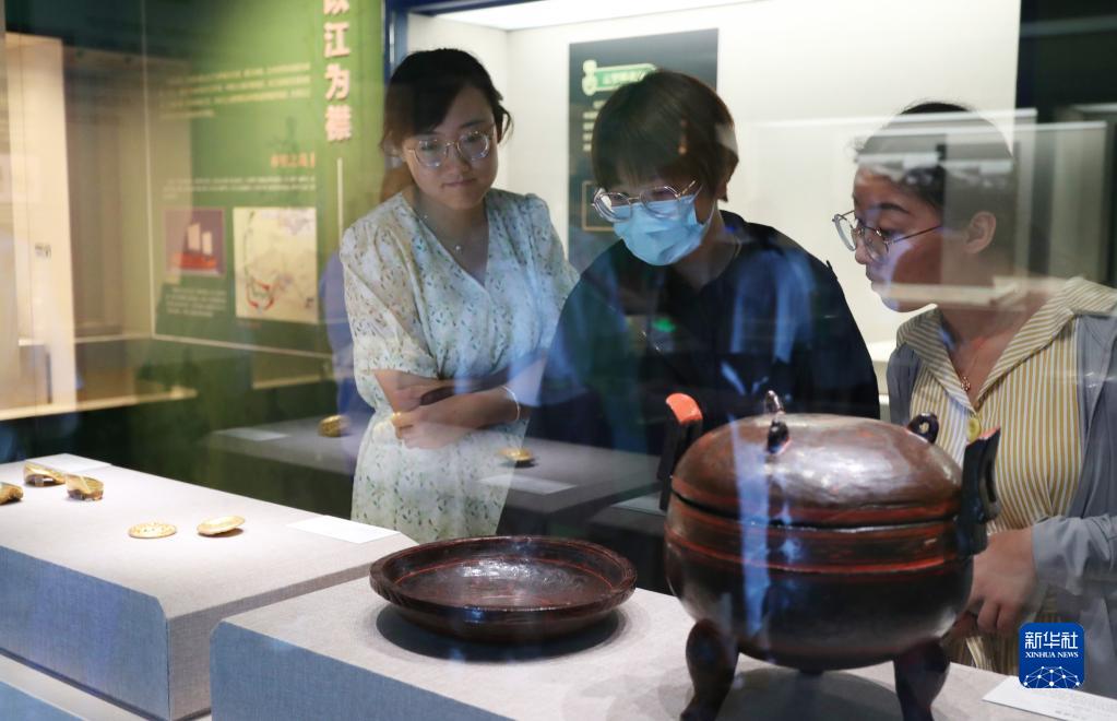 7月10日,參觀(guān)者在一組漆器展品前駐足觀(guān)看。